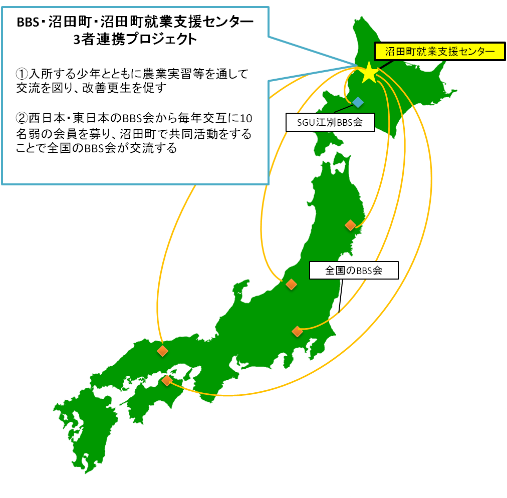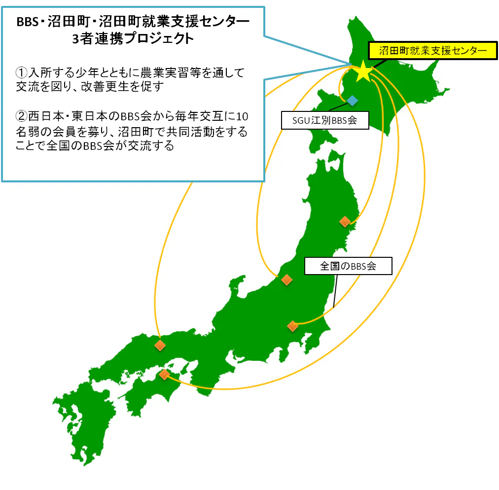そこで、従来から、国の施設である沼田町就業支援センターと町を挙げて再犯・再非行防止に取り組んでいる沼田町との連携に、新たに民間協力者であるBBSがその輪に加わることにより、3者が一体となった再犯防止の取組をさらに推し進めるとともに、こうした取組を広く知っていただくことが、このプロジェクトの目的です。」と教えてくださりました。