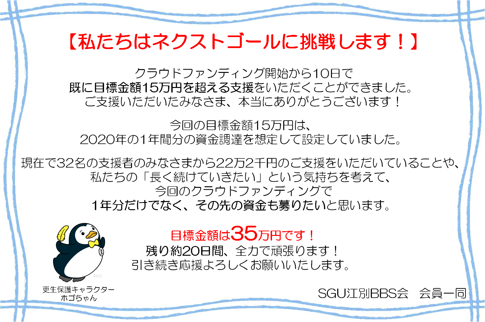 2020/02/19 11:31SGU江別BBS会です!!皆様のおかげで、51名の方から397,000円と多くのご支援をいただくことができました。ご支援・拡散のご協力・応援メッセージ等ありがとうございました!!集めた資金は、来年度からの2年間分の資金となります。就業支援センターの少年たちが更生をし、より良いスタートを切れるようSGU江別BBS会でサポートしていきます。活動状況等はTwitter・Facebookの2つで更新していきますので、チェックしてみてください。引き続き、沼田町プロジェクト及び私たちSGU江別BBS会の応援よろしくお願いいたします!Twitter→ https://twitter.com/sgubbskaiFacebook→ https://www.facebook.com/sguebetsubbs/?tn-str=k*F もっと見る【ご協力・ご支援のお願い】ネクストゴールに挑戦します!