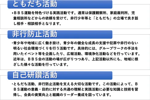 具体的な活動として、非行少年・少女や社会にうまくなじめない少年・少女に対し、地域の関係機関・団体等と協力し、レクリエーションや家庭教師などその少年に合わせた形で「ともだち」になることを通し、彼ら・彼女らの自立を支援する「ともだち活動」のほか、「非行防止活動」「自己研鑽活動」などを行っています。