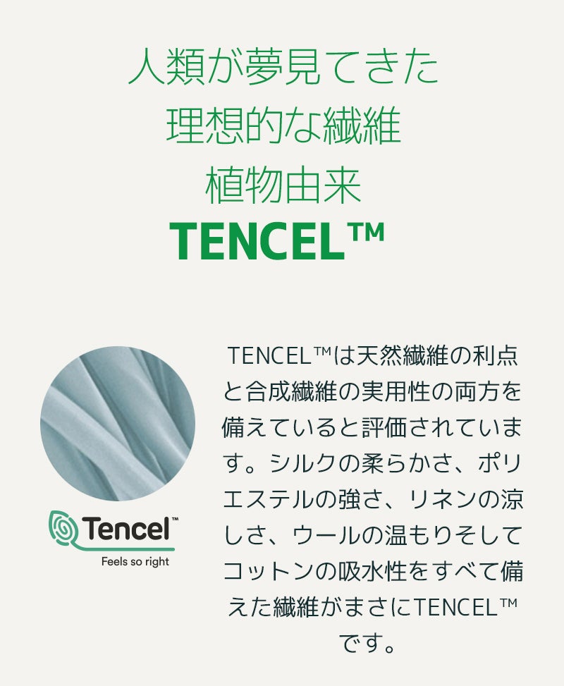 TENCEL™25%TENCEL25%を使用するだけで、綿を栽培するのに必要な水と土地を25%も削減することができるので、国際FSAで環境賞を受賞しました。 TENCEL™は、化学物質が含まれていないため、敏感肌にも安心してお使い頂ける自然の繊維です。化学物質がないため、敏感肌にも安心して使用できる自然から繊維です。