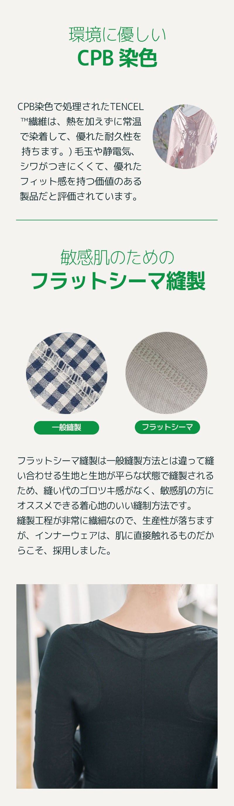肌に触れるインナー「All-Bareun」は単価が高いため、あまり使われてないCPB(Cold Pad Batch)染色方法を使っています。CPB染色で処理されたTENCEL™繊維は、毛玉や静電気、シワのつきにくくて、優れたフィット感を持つ価値がある製品と評価されています。