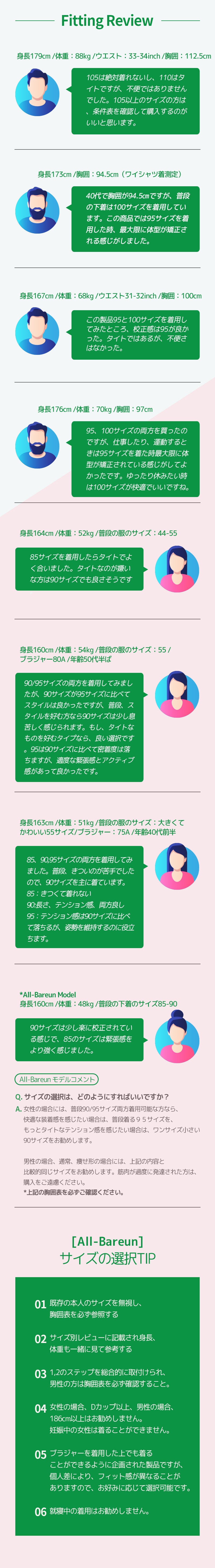 A.女性の場合、例えば、通常の90、95サイズ両サイズとも着用が可能な方で、快適な着心地をご希望の場合、普段のサイズよりタイトなテンション感を感じたいなら90、95サイズの中からワンサイズ小さいサイズである90サイズをオススメします。