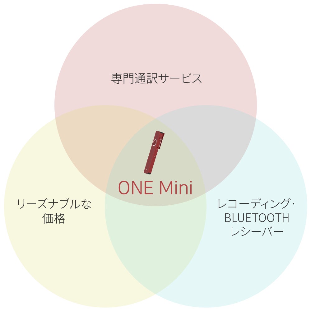 A. 「One mini」 にはリアルタイム専門通訳機能が搭載、専門的な通訳が必要な場面などでの通訳ができるサービスをご提供します。また海外で初めて出会った外国人の方の目の前に自分のスマホを出すのも不安でしょう。「One mini」 さえあればスマホを出さなくても翻訳・専門通訳機能を使えます。さらにBluetoothレシーバー機能付きなので有線イヤホンをワイヤレスイヤホンとして使うこともできます。