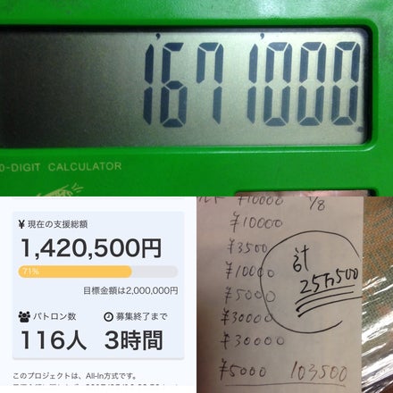 2017/05/16 21:20ただいまの合計ご支援額 1671000円!! クラウドファンディング上ではサクセスとはなりませんが、あと329000円で目標200万円達成です!! お客様のご意向で、店舗でもご支援いただくことができました!泣 あと3時間!! どうかロティの神様!! 一生無料30万円をもうひとかた!!! 宜しくお願い致します!! もっと見る