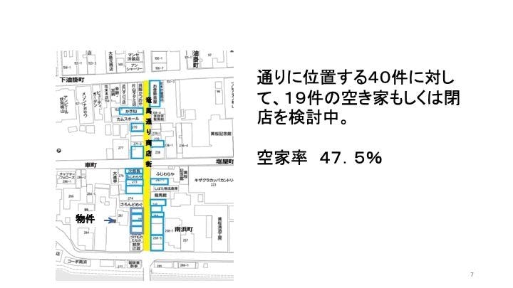 この物件について、竜馬通り商店街の役員の方から、このまま住宅になってしまうと一層商店街が寂れてしまうということで相談がありました。