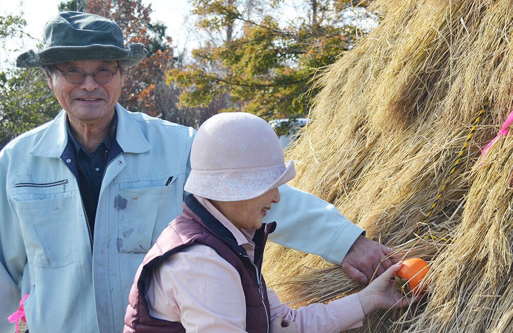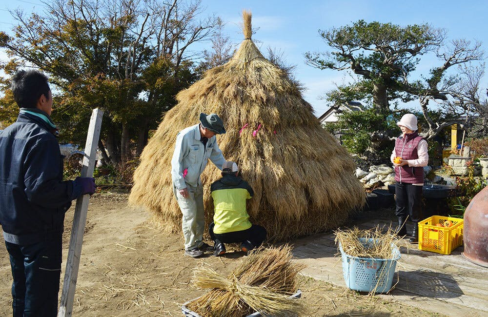 2019年11月22日(金)に、稲わらで昔ながらの「藁にお」を自前で作成し、柿の渋抜きのための柿入れ作業を行いました。昔から伝わる渋抜き法で、約2週間かけて稲わらの力で渋を抜きます。