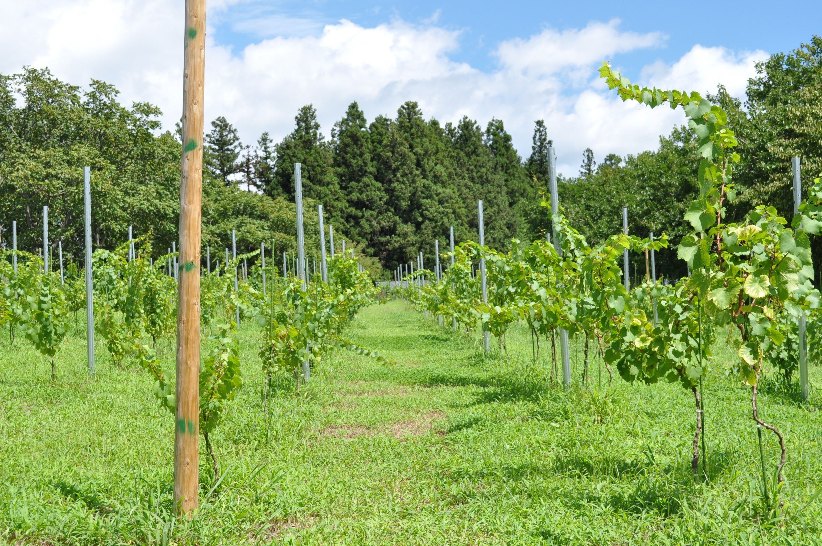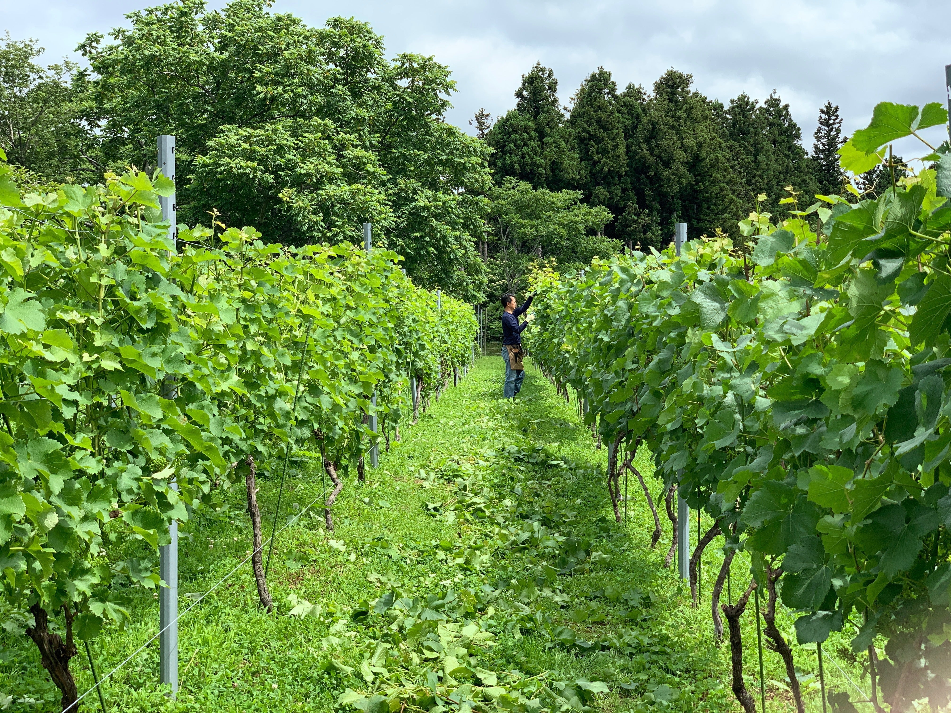 2014年から大船渡市猪川町(いかわちょう)に畑を借り、シャルドネとソーヴィニヨンブランという品種を600本ほど植えました。ぶどう畑は英語で「ヴィンヤード」と呼ぶことから、この畑を「猪川町ヴィンヤード」と名付けました。実は母校の裏手にあり、思い入れのある場所です。