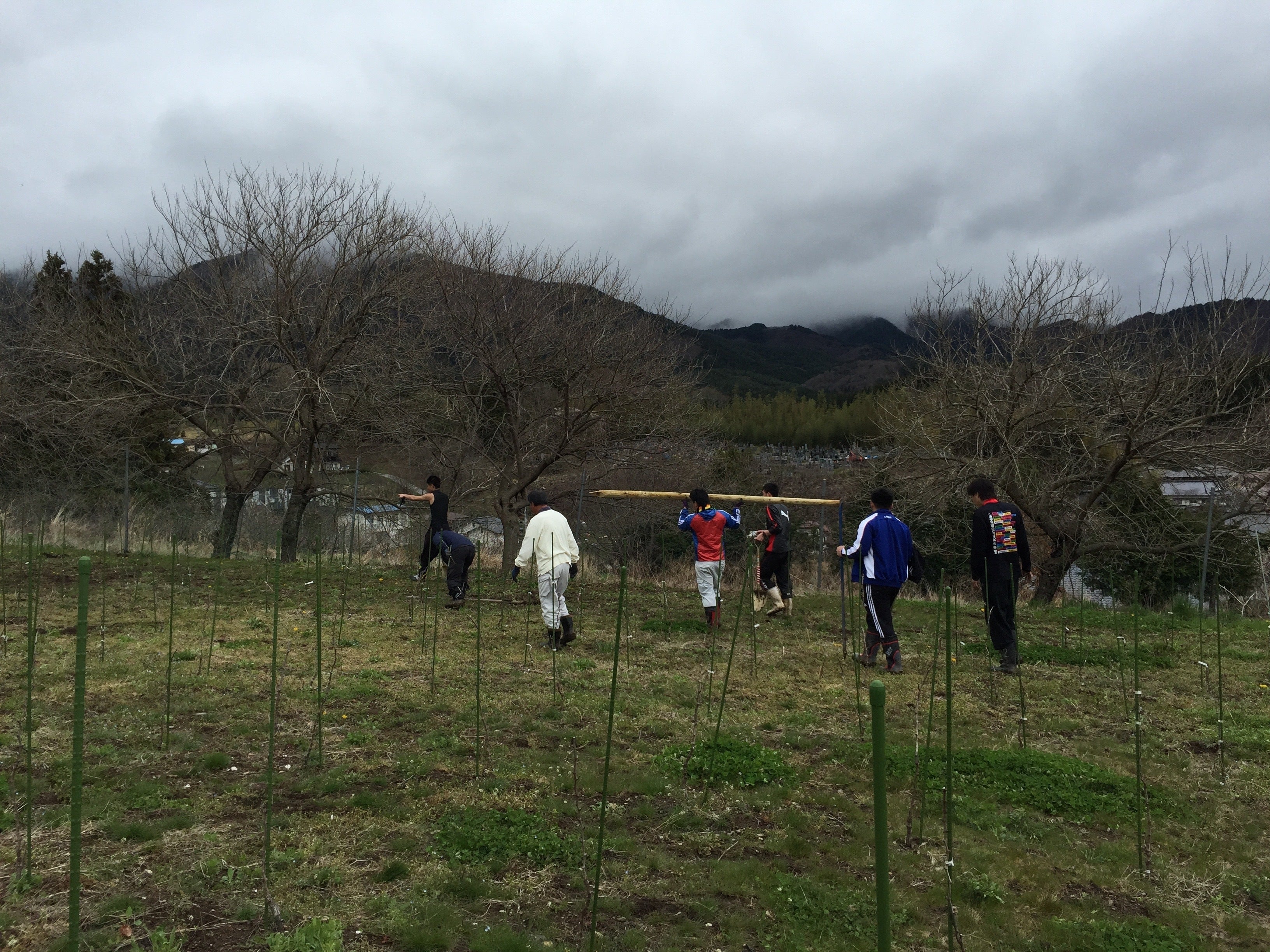 ▲ぶどう畑で作業を手伝ってくれたボランティアの皆さん(2015年4月)
