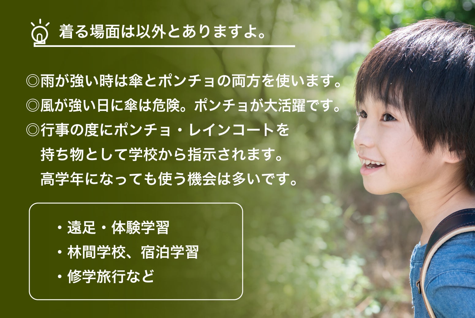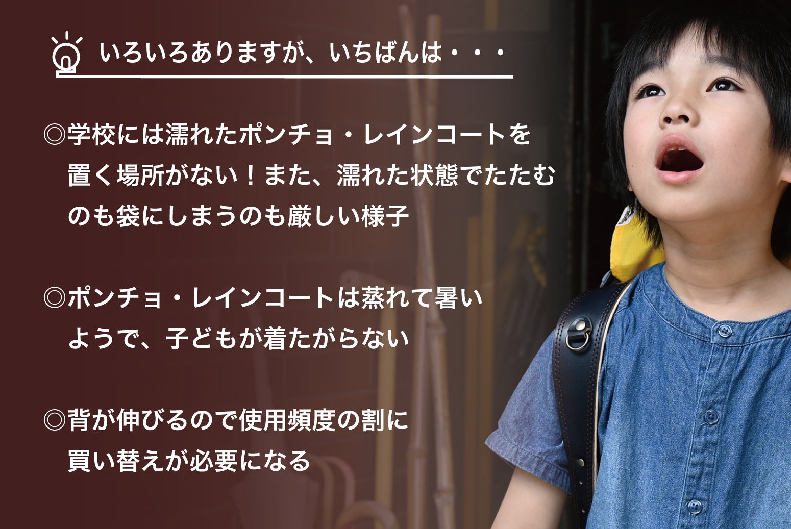 小学校生活で、雨の日を快適に過ごせるお手伝いができれば幸いです。
