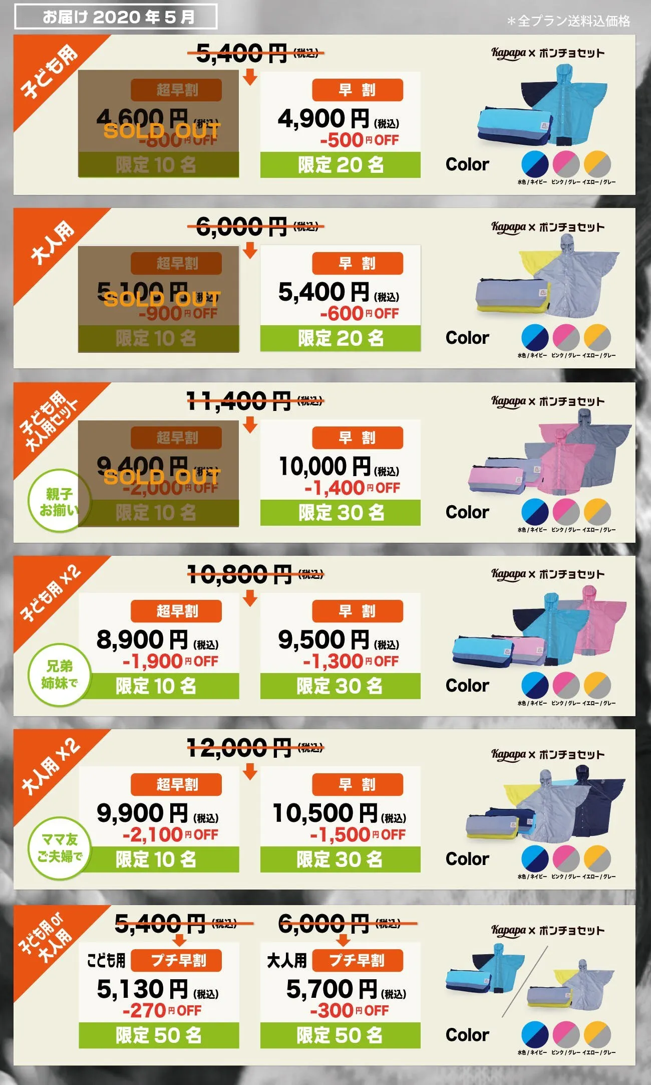 かっぱっぱポンチョセット(子ども用・大人用)及び、サコッシュのリターン品のお届けについて、コロナウィルスによる工場生産への影響により、商品のお届け予定が変更になりました事をお知らせいたします。