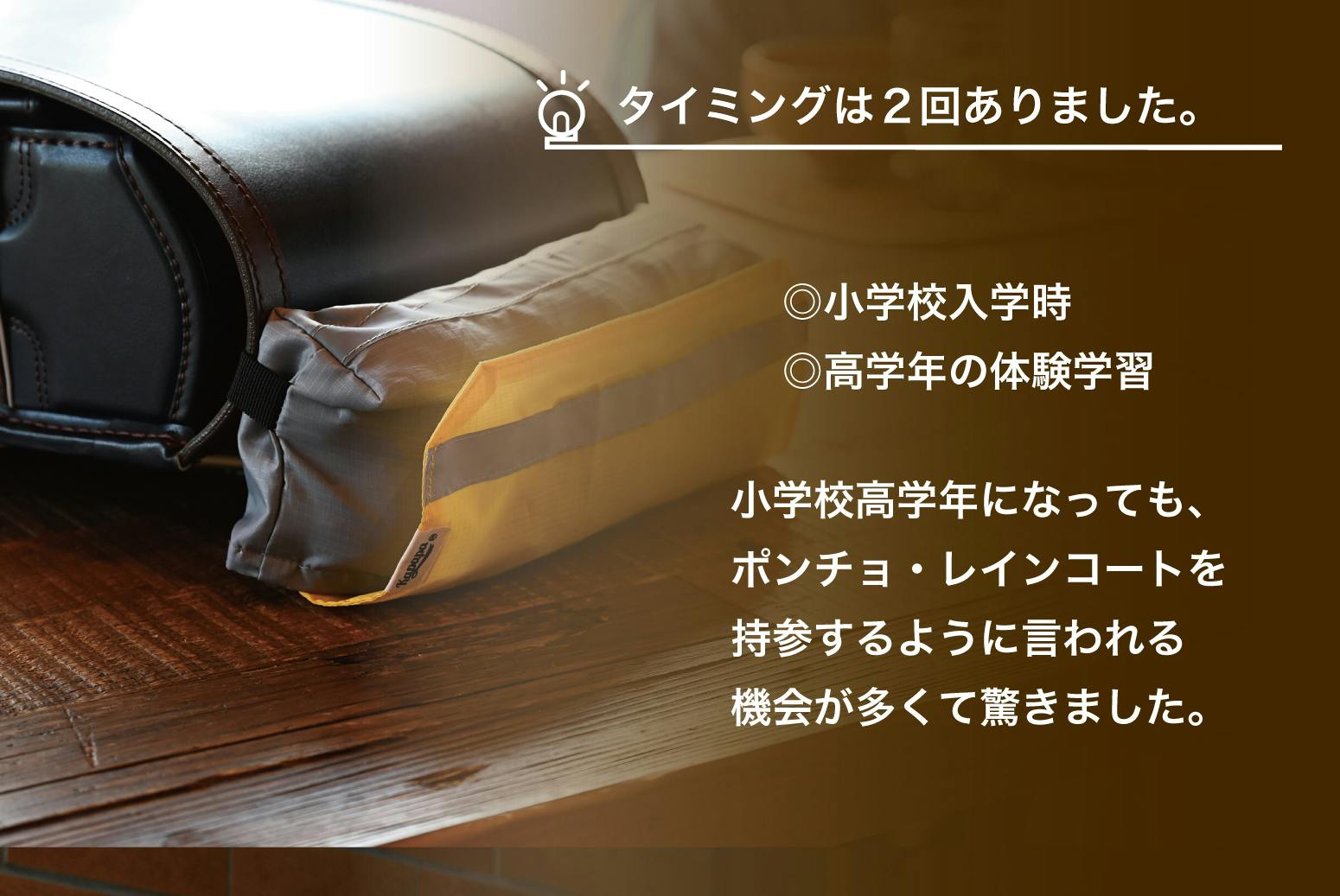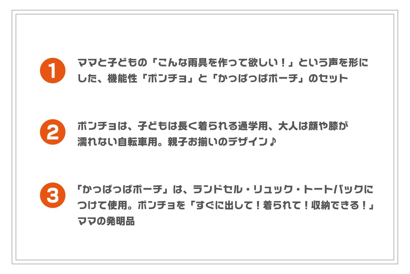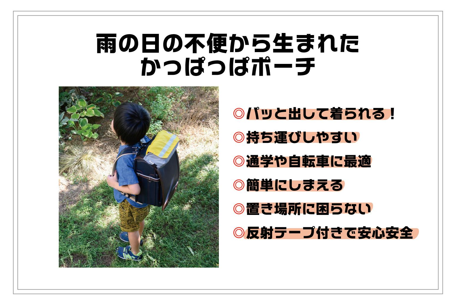 長男が小学校1年生の遠足時に雨が降り、「リュックの上からレインコートが着られなかった・・・」と全身ずぶ濡れになって帰ってきたことをきっかけに、低学年の不器用な子どもでもランドセルやリュックの上からポンチョ・レインコートが1人で簡単に着られる雨具収納ポーチ「かっぱっぱポーチ」をつくりました。