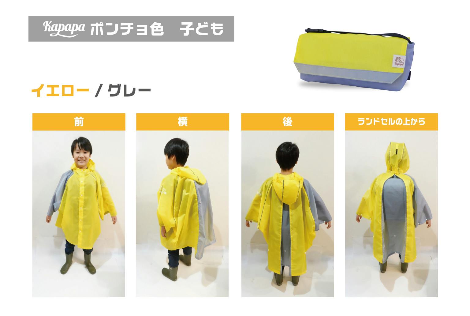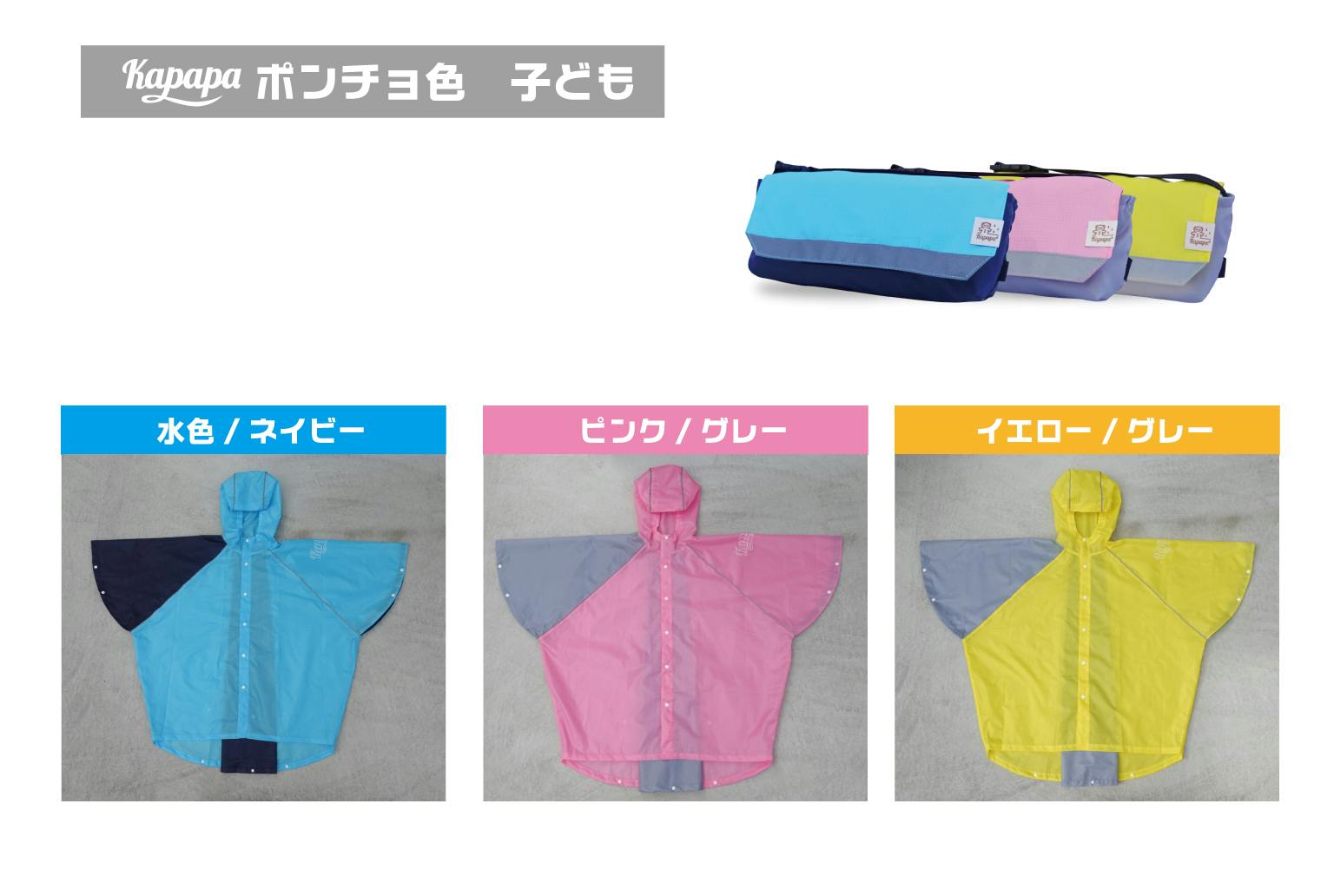 「かっぱっぱ&ポンチョセット」は、ママたちの「こんな雨具があったらいいな!」を実現したい、憂鬱で不便な雨の日を楽しくて安心できる日に変えたい!という想いから生まれた、ポンチョと雨具収納ポーチ「かっぱっぱポーチ」のセットです。