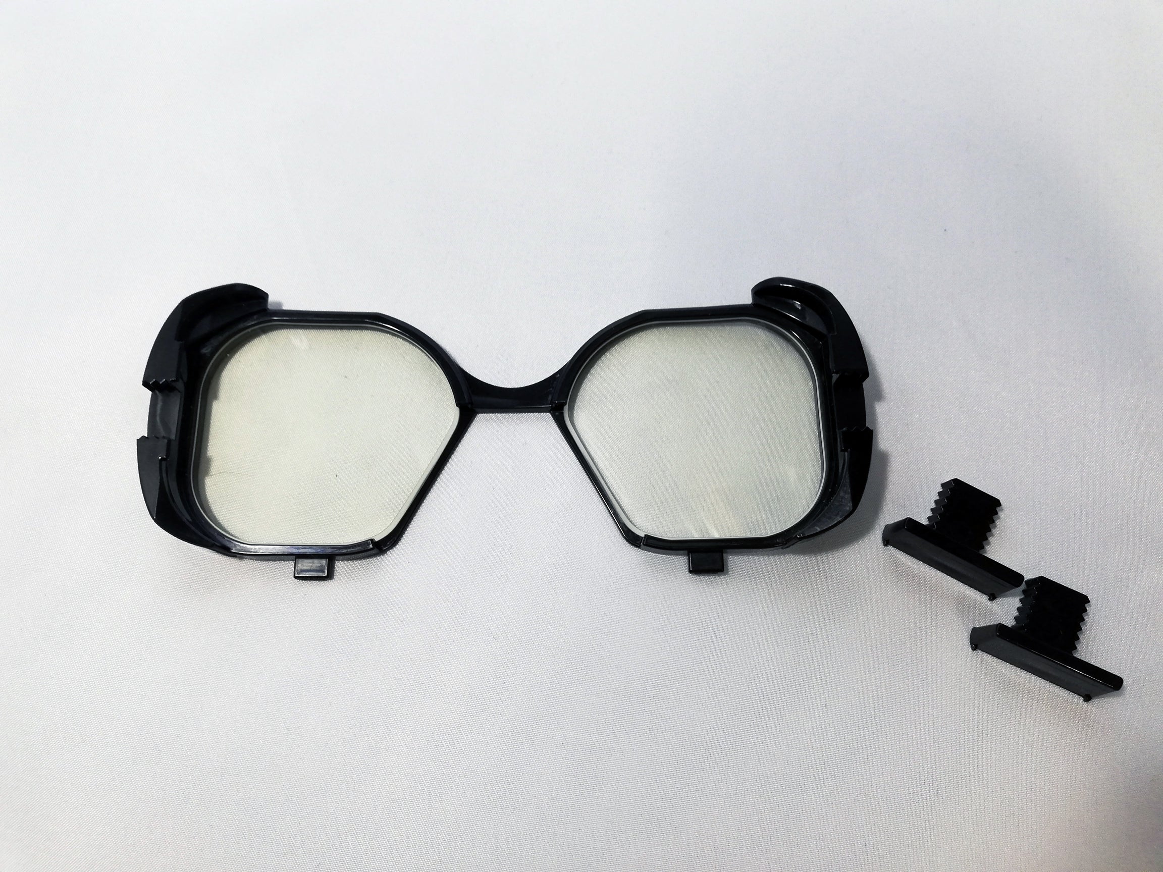 これまでの試作品は3Dプリンタで作られたものでしたが、今回届いたのは金型で作られた生産品ですので、通常のメガネフレーム、特に耐久性が求められるアウトドア用のサングラスなどに使われますポリアミド樹脂製です。この光沢と質感、通常お店で販売されている眼鏡と同じで触っていて感慨深いです。