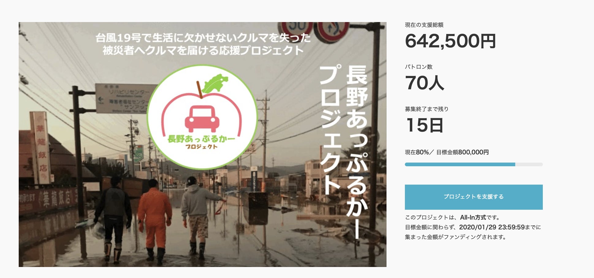 12/14(水)より始動した長野あっぷるかープロジェクトですが多くの皆様のご支援、ご協力により本日、支援金額が80万円を超え、目標金額を達成することができました。ご賛同いただいた皆様、本当にありがとうございました。シェア、拡散をしていただいた皆様にも御礼申し上げます。先日には、クルマの貸出を行いました。無料でクルマを利用できて助かったというお言葉をいただきこのプロジェクトを初めて良かったと改めて実感いたしました。残すところ、後7日となりましたが、引き続きよろしくお願い申し上げます。写真の乗用車は、「日本笑顔プロジェクト」様より寄付していただきました!