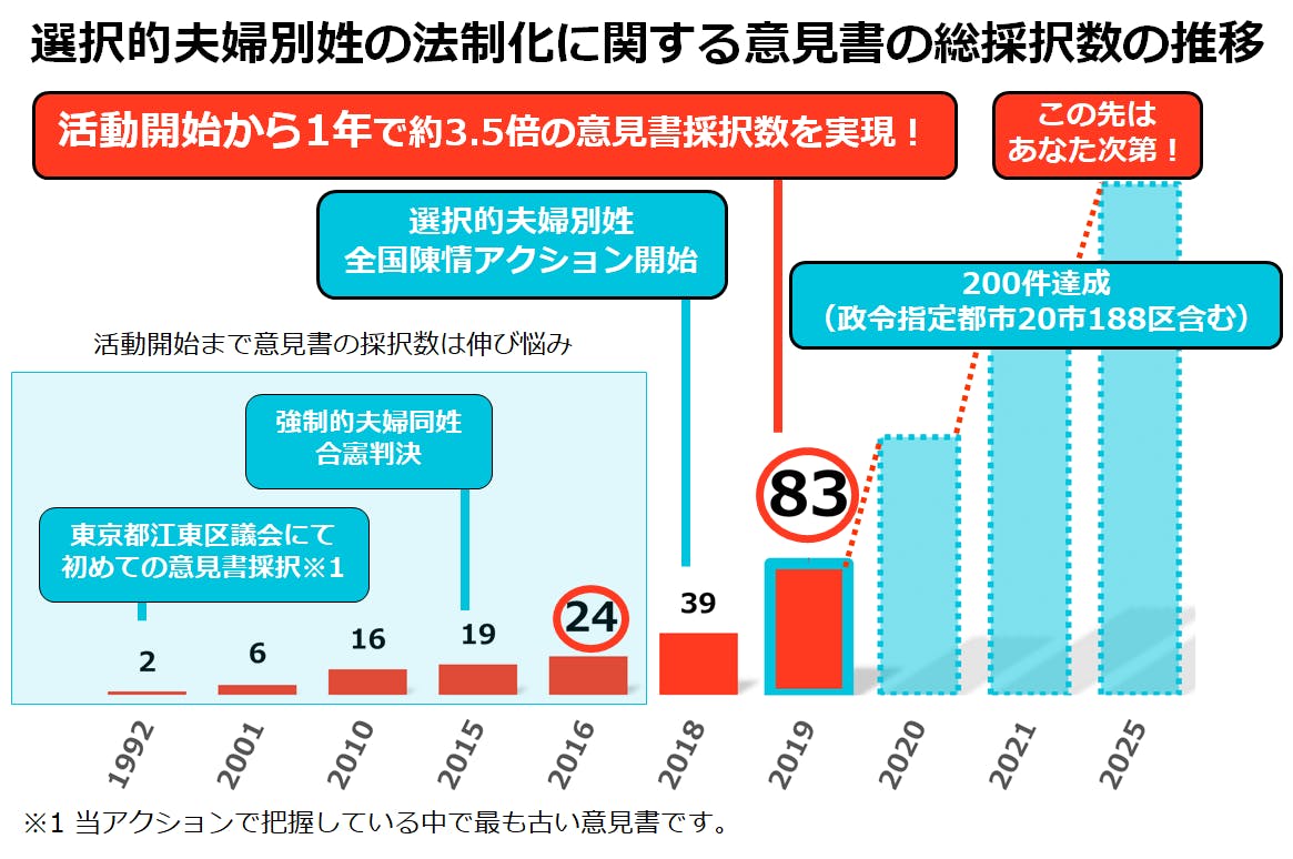 全国規模で「選択的夫婦別姓導入を求める意見書」の採択活動をしています。