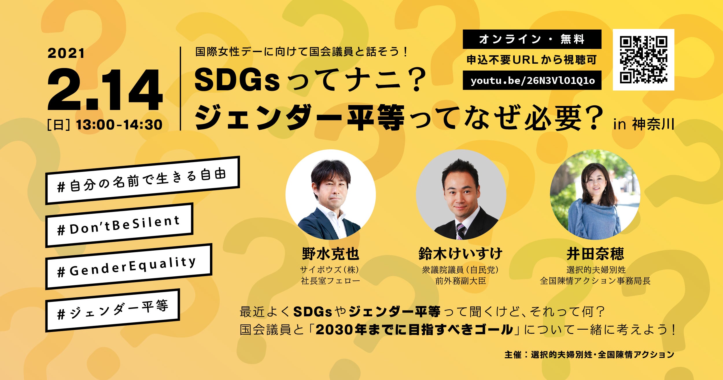 選択的夫婦別姓・全国陳情アクション神奈川県メンバーが、地元選出の自民党・鈴木けいすけ衆議院議員とともに「2030 年までに目指すべき到達地点」について一緒に考えるYou Tube Liveイベントを開催します。SDGsの概要を解説してくださるのは、「がんばるな、ニッポン」のCMでおなじみ、サイボウズ株式会社社長室フェローで、地方創生×働き方改革を日本全国で啓蒙中の野水克也さんです。