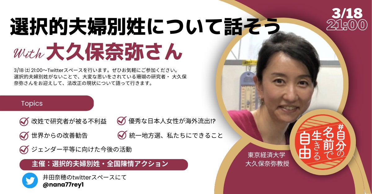 3/18(土)21:00〜Twitterスペース「選択的夫婦別姓について話そう!」を実施します。