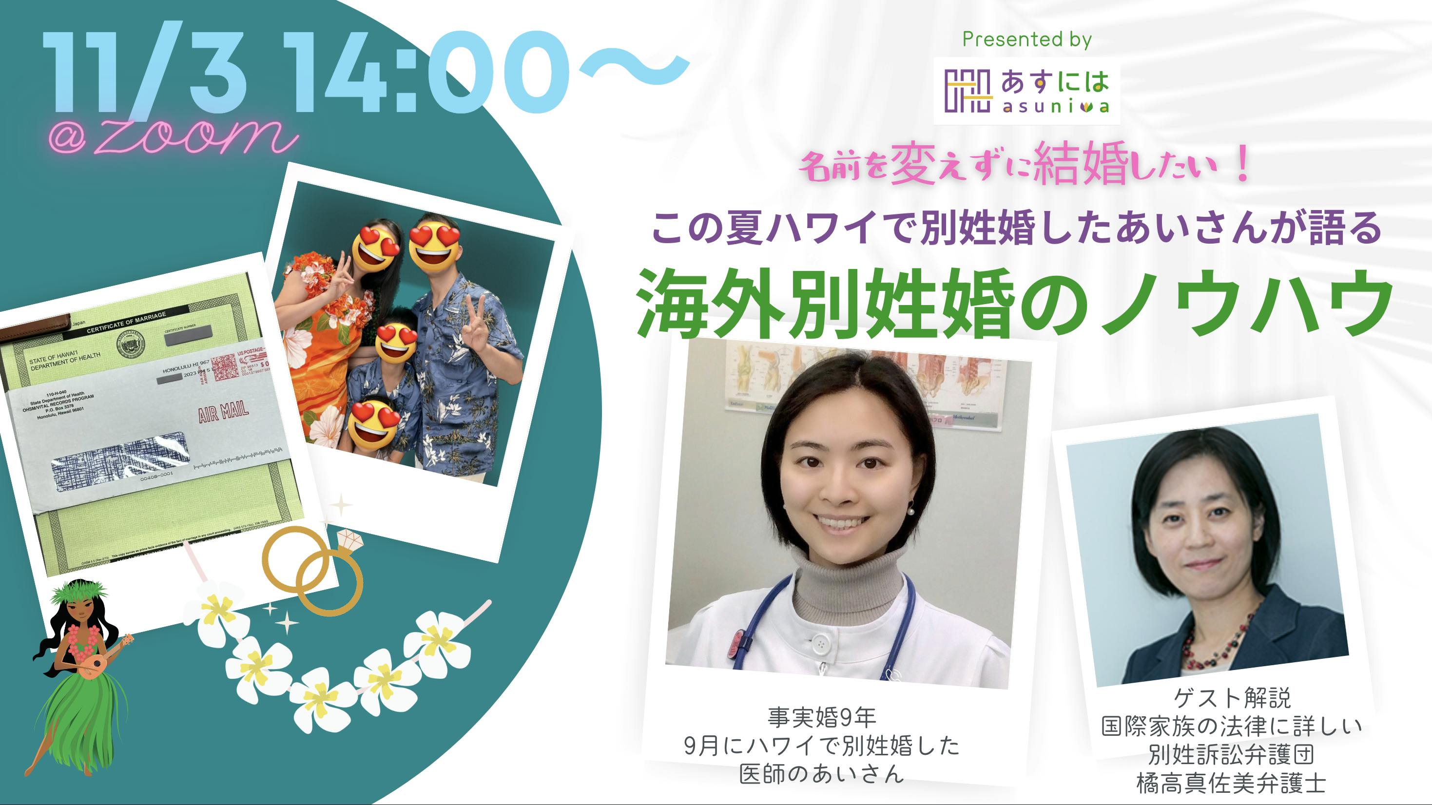 そのノウハウや実感を、2023年11月3日(祝)に一挙大公開していただくオンライントークイベントを開催することにしました。国際家族の法律に詳しい別姓訴訟弁護団・橘高真佐美弁護士も登壇し、「相続は?親権は?海外別姓婚する法的メリットと残る問題点」を解説していただきます。
