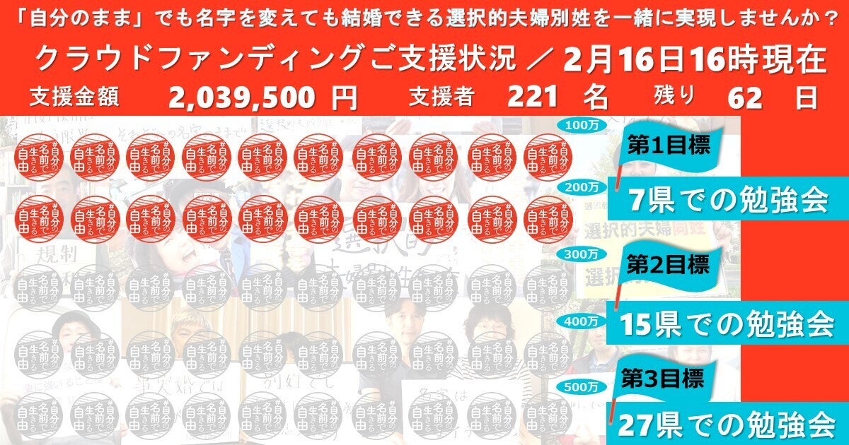 開始3日目にして、200万円のご支援をいただきました!221人(2月16日 16時30分現在)の皆さま、本当にありがとうございます。支援の実績は、資金だけではなく「世の中にこれだけの声があるんだ」というアピールにもなります。あと62日、よろしくお願いいたします!選択的夫婦別姓を望みながらも「どう行動すれば良いかわからない」「待つしかなかった」「陳情活動、やってみたいけど今はできない」そんな方々が思いを形にできるのがこのクラウドファンディングプロジェクトだと考えています。世論をどんどん巻き込んで、選択的夫婦別姓の実現につなげていきましょう!