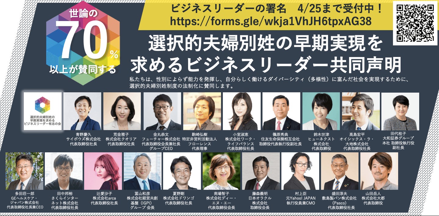 「選択的夫婦別姓の早期実現を求めるビジネスリーダー有志の会」発足と署名開始のお知らせ4/1〜25で1,000人以上賛同を集め、総理・大臣手交を目指す2021年4月1日、「選択的夫婦別姓の早期実現を求めるビジネスリーダー有志の会」が発足されました。当事者の声に応え、錚々たる企業経営者の方々が19人共同呼びかけ人に名を連ねて下さいました。ぜひ以下概要をご覧ください。【4/25まで】「選択的夫婦別姓の早期実現を求めるビジネスリーダー有志の会」賛同署名ご協力のお願い期間:2021年4月1日(木)〜25日(日)対象:企業・団体の経営者、役員の皆様共同声がけ人氏名(50音順/敬称略) 青野慶久 サイボウズ株式会社 代表取締役社長荒金雅子 株式会社クオリア 代表取締役社長金丸恭文 フューチャー株式会社 代表取締役会長兼社長グループCEO駒崎弘樹 特定非営利活動法人フローレンス 代表理事小室淑恵 株式会社ワーク・ライフバランス 代表取締役社長篠原秀典 住友生命保険相互会社 取締役代表執行役副社長鈴木世津 ヒューネクスト株式会社 代表取締役髙島宏平 オイシックス・ラ・大地株式会社 代表取締役社長田代桂子 大和証券グループ本社 取締役執行役副社長多田荘一郎 GEヘルスケア・ジャパン株式会社 代表取締役社長兼CEO田中邦裕 さくらインターネット株式会社 代表取締役社長辻愛沙子 株式会社arca 代表取締役社長冨山和彦 株式会社経営共創基盤(IGPI)グループ 会長夏野剛 株式会社ドワンゴ 代表取締役社長南場智子 株式会社ディー・エヌ・エー 取締役会長藤森義明 日本オラクル株式会社 取締役会長村上臣 元Yahoo! JAPAN 執行役員兼CMO盛田淳夫 敷島製パン株式会社(Pasco) 代表取締役社長山田岳人 株式会社大都 代表取締役 夫婦同姓を義務付ける国は世界で日本だけであり、現在は96%女性が改姓をしています。しかし望まない改姓は人権問題であり、ビジネスの現場に旧姓の通称使用を義務付けたとしても、人事・経理・総務・法務などで、確認作業の煩雑さや業務負荷が生じています。そこで「望む人だけが改姓し、望まない改姓をゼロにする」ために、経済界からも法改正を呼びかけていただくこととなりました。ビジネスシーンで「なぜ法改正が必要なのか?」事務局の解説ページをご参照ください(添付もあり)。ビジネスリーダーからの賛同コメントはこちらで更新します。実情に問題を感じた法律の専門家の皆様も、すでに法改正を求める声明を出してくださっています。法学者・法曹有志【共同声明全文】「私たち法学者・法曹は、選択的夫婦別氏制度の早期実現を求めます」 日本女性法律家協会 要望書の提出(2020.7.15)-「選択的夫婦別姓」の実現について 日本組織内弁護士協会 夫婦別姓制度の導入に関する理事長声明今後の流れ・目標4月25日までに1,000人を目標に署名を募り、5月初旬には菅義偉内閣総理大臣はじめ、関係閣僚および主要政党に手交したいと考えております。一人でも多くの賛同の意思を国に届けたく、皆様のご所属企業の代表の方、お知り合いの企業経営者・役員の方々にも以下ページをお知らせいただけましたら幸いです。【4/25まで】「選択的夫婦別姓の早期実現を求めるビジネスリーダー有志の会」賛同署名ご協力のお願いどうぞよろしくお願い申し上げます。____________選択的夫婦別姓・全国陳情アクション 事務局長 井田奈穂(いだなほ)chinjyoaction@gmail.comTwitter ⇐最新情報はここで発信していますFacebook____________