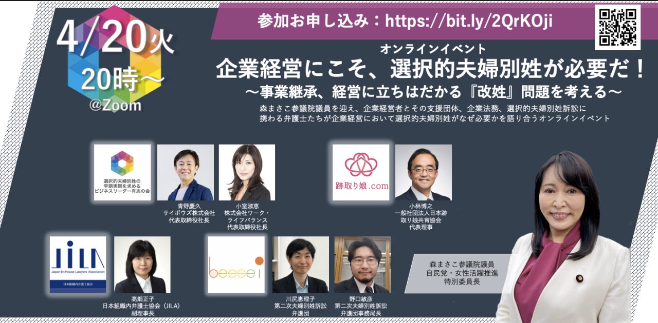 「仕事と改姓」で悩んでいる皆さん、政治や経営のリーダーに声を届けませんか?4/1設立の「選択的夫婦別姓の早期実現を求めるビジネスリーダー有志の会」、おかげさまで本日現在、約350人の経営者・役員の方々のご署名をいただいております。4月25日までぜひ1,000名の大台を超え、政府及び最高裁判所にも世論の変化を示したく、お知り合いの経営層の方々、経済団体などにもご署名を呼びかけていただけたら幸いです!さて、ビジネスリーダー有志の会では、折しも女性企業経営者における「夫婦同姓問題」に関する意識調査を実施しておられる一般社団法人日本跡取り娘共育協会さんと共催で以下イベントを開催いたします。どなたでもご参加可能。事前登録いただいた方にZoomのURLをお送りします。4/20(火)20時 企業経営にこそ、選択的夫婦別姓が必要だ! 〜事業継承、経営に立ちはだかる『改姓』問題を考える〜自民党副幹事長・女性活躍推進特別委員長の森まさこ参議院議員を迎え、企業経営者や経営コンサルタント、企業法務、選択的夫婦別姓訴訟に携わる弁護士たちが、強制的夫婦同姓制度下の経営にまつわる問題を一緒に考えるオンラインイベントです。日時:4月20日(火)20:00〜21:30@Zoomお申込み:https://note.com/biz_leaders/n/n0fda586266c5登壇者立法府議員の立場から森まさこ参議院議員/自民党・女性活躍推進特別委員長企業経営者・経営コンサルタントの立場から青野慶久氏 サイボウズ株式会社代表取締役社長小室淑恵氏 株式会社ワーク・ライフバランス代表取締役社長小林博之氏 一般社団法人日本跡取り娘共育協会代表理事企業法務に携わる弁護士の立場から髙畑正子氏 日本組織内弁護士協会(JILA)副理事長選択的夫婦別姓訴訟弁護団の立場から野口敏彦氏 第二次夫婦別姓訴訟弁護団事務局長川尻恵理子氏 第二次夫婦別姓訴訟弁護団その他、ビジネスリーダーの皆様もセッションに参加していただきます。ジェンダー平等の遅れが叫ばれる中、望まない改姓を国が強いることは、企業経営ひいては日本の経済・国際競争力の成長にとってもマイナス要因でしかありません。法的行為、海外渡航、登記、投資、保険、納税、各種資格、特許、学会での論文発表などにおいて、法的根拠のない旧姓の通称使用は不可の場面が多く、企業実務の現場に使用許可を義務付けたとしても、2つ以上の氏名を使い分けることにより、様々な混乱が生じます。このようなビジネスシーンにおける改姓の問題を多くの方とご一緒に考える機会になれば幸いです。お問合せ先:「選択的夫婦別姓の早期実現を求めるビジネスリーダー有志の会」事務局 bizleadersstaff@gmail.com____________選択的夫婦別姓・全国陳情アクション https://chinjyo-action.com/事務局長 井田奈穂(いだなほ)chinjyoaction@gmail.comhttps://twitter.com/nana77rey1____________添付ファイル エリア