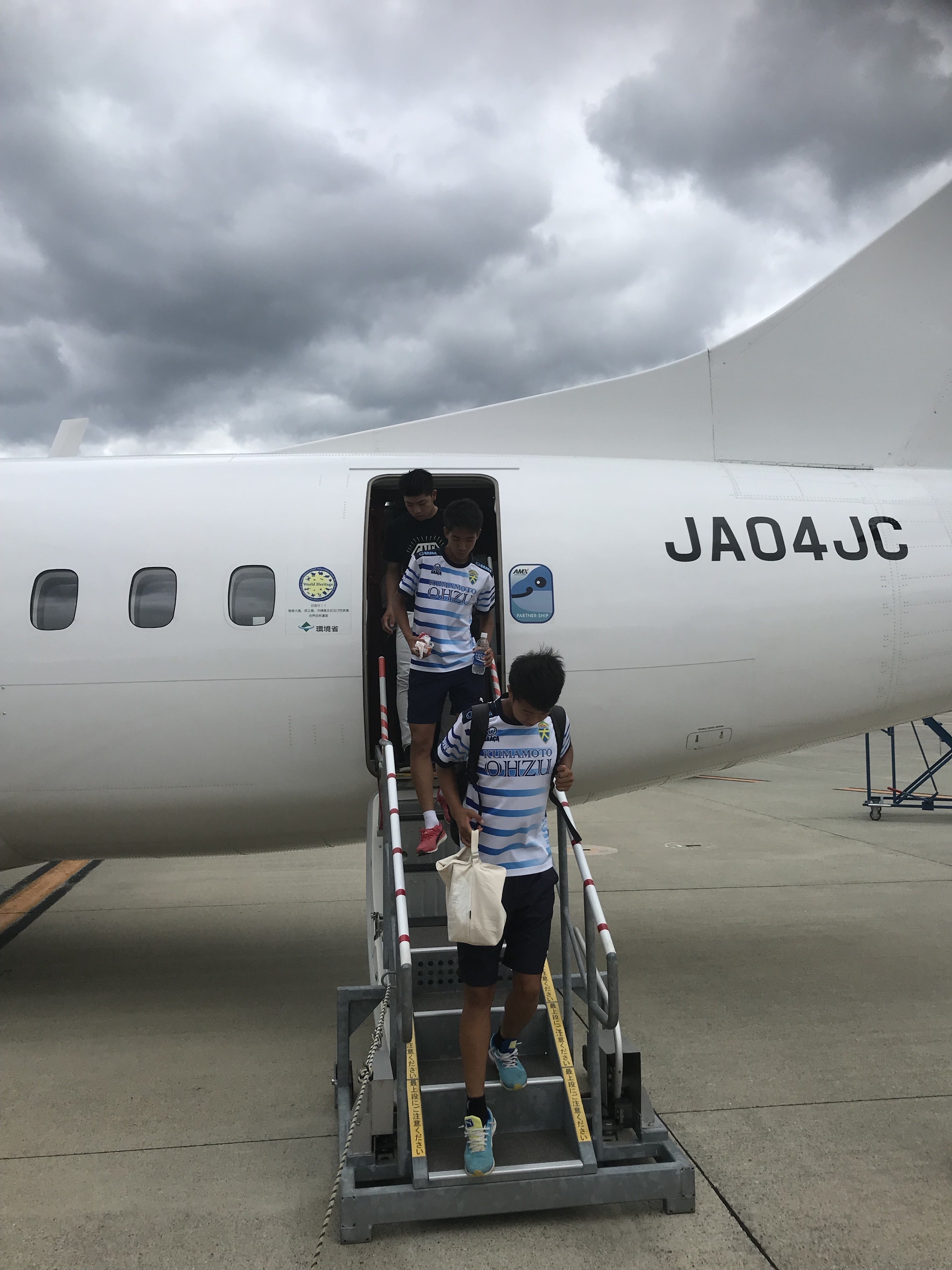 試合当日に朝から飛行機で試合会場のある愛知県に移動する選手達