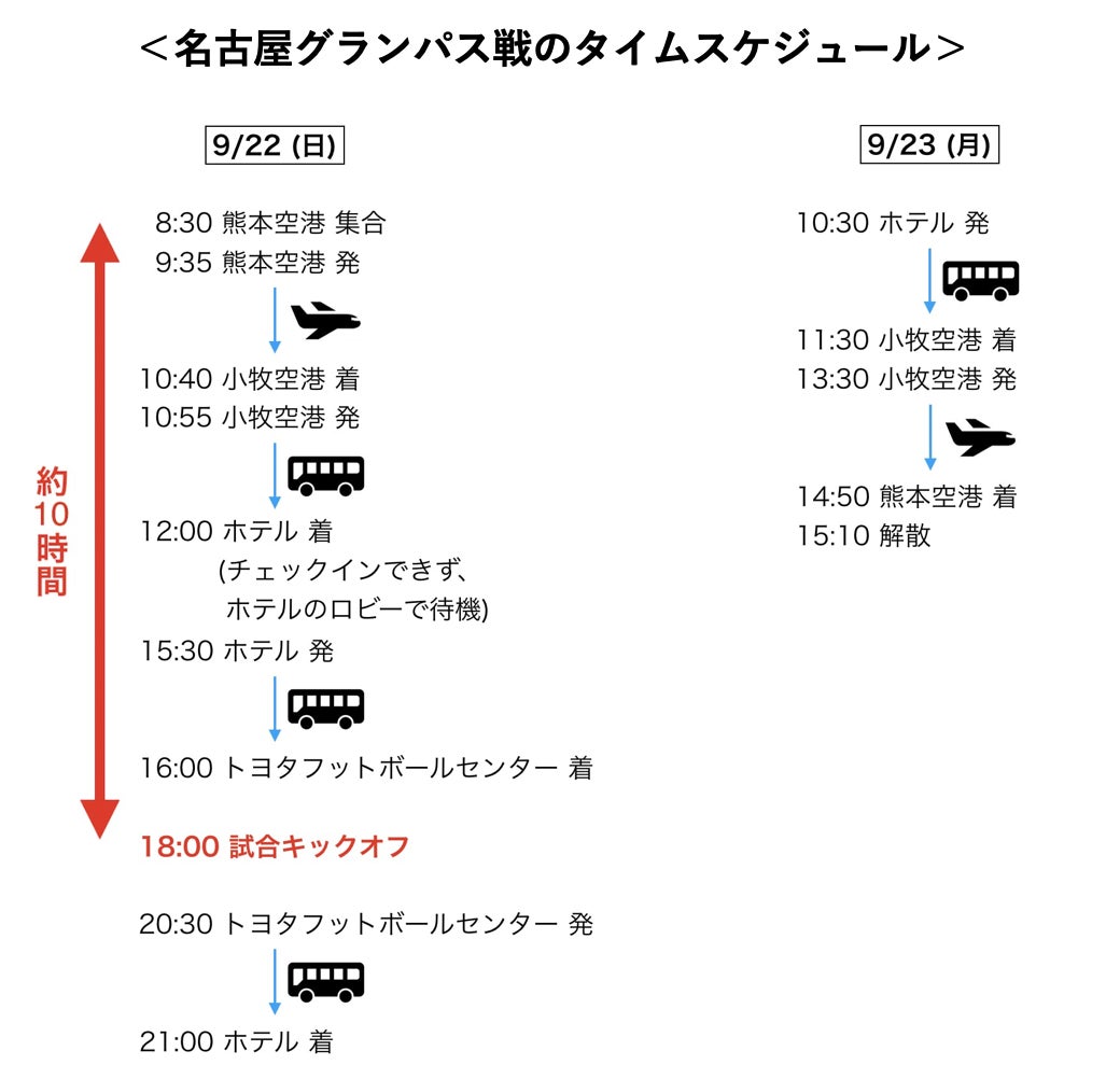 上の図を見ていただいたらわかるように、名古屋開催のアウェイでの試合では、飛行機やバスでの移動と待機時間も含め、集合から試合のキックオフまでに約10時間もの時間がかかっています。