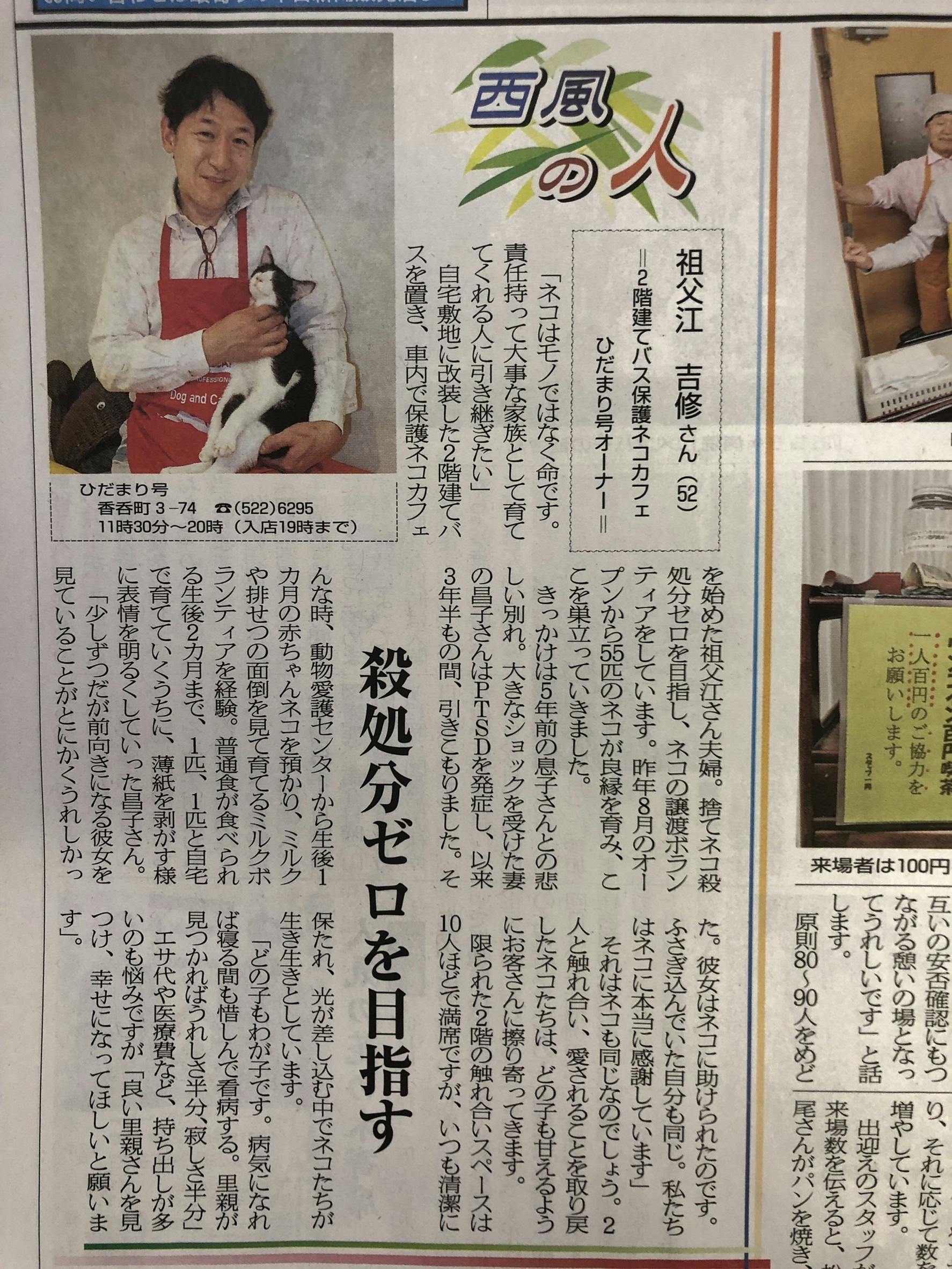 2018年8月1日にひだまり号をオープンして以来 120匹近くの猫と里親さんの縁を結びました。新聞、テレビなどで何度か紹介していただきました。