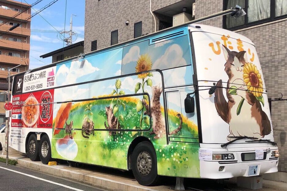 名古屋市西区に保護猫カフェひだまり号はあります。ここは住宅街です。市バスのバス停の前に大きな二階建てバスが停まっており、一際目立っています。市バスは名古屋城を経由し栄へ向かっています。ひだまり号にお越しいただくには地下鉄なら鶴舞線で庄内通で降りて頂き徒歩7分 栄からは市バスで25分 香呑町下車 徒歩1分 名古屋高速なら庄内通で下りていただき3分