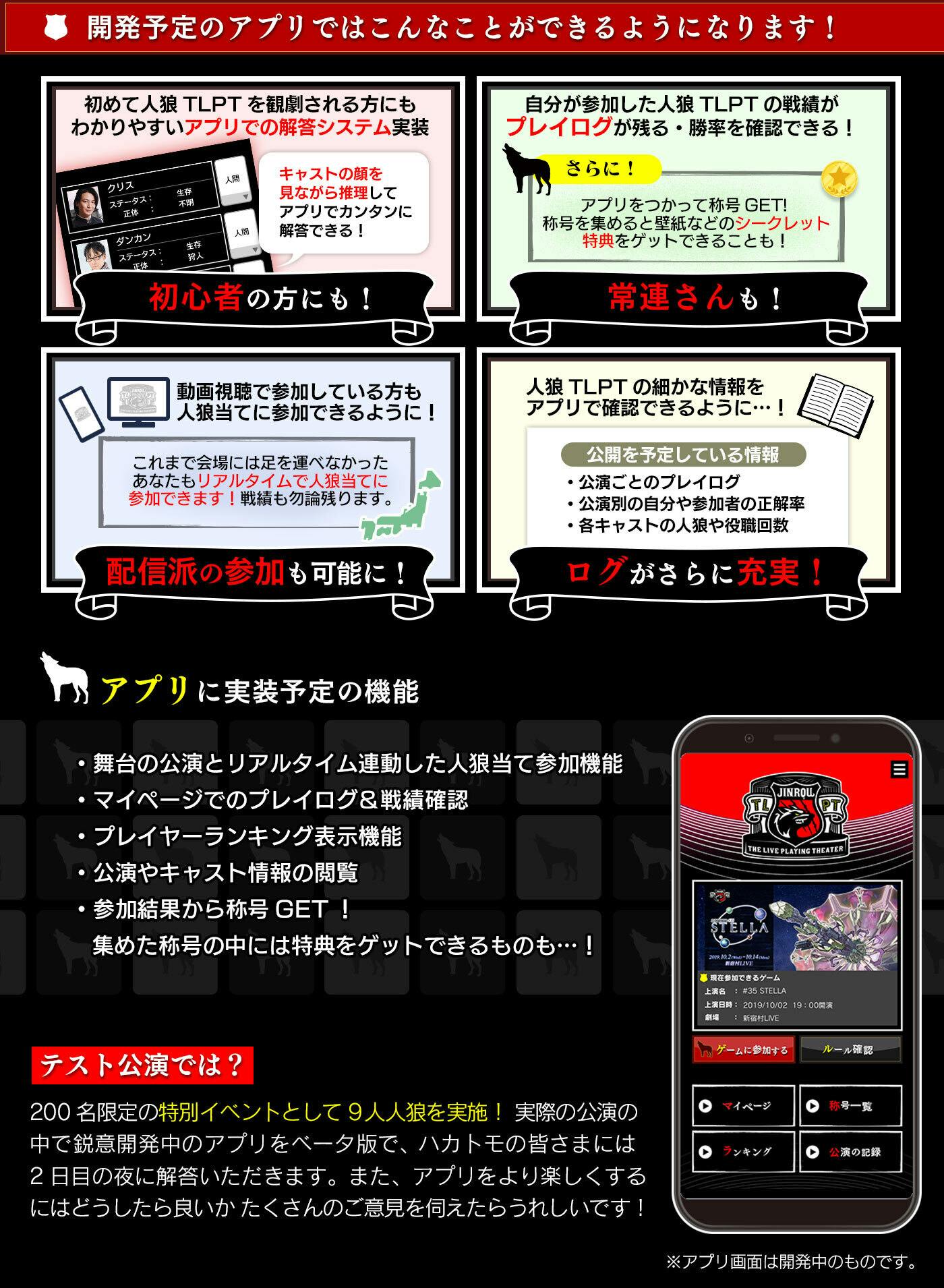 前回のプロジェクトで312人の方からのご支援により「人狼TLPT」アプリの開発を開始する事が出来ました。2020年2月1日(土)には公演という形でアプリテストを実施します。この公演にたくさんの皆さまにご参加いただき盛り上がりたいです。