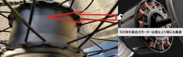 とにかく、衝撃のアシスト力を発揮してくれる500Wハイパワーブラシレスモーターが後輪の中に組み込まれています。