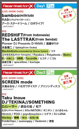 2017/04/04 11:46「リアニメーション10」の追加出演者として11名が決定しました! <DAY1> Blacklolita(Recommended by Diverse System)BistroBmiki_t5時間Tacumille <DAY2> DJシーザーMackey鯉幟nkw a.k.a なか卯はるいぬ もっと見る