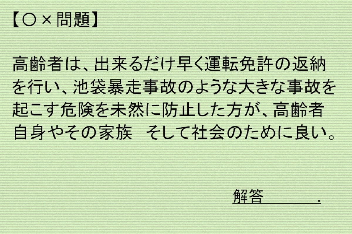 まず 安全運転の高齢ドライバーは多い。高齢ドライバー問題で 一番大きな問題の本質は、既に 運転してはいけない人が多いこと。認知機能 運動機能が著しく低下している等、危険な状態で運転を“今現在”も続ける高齢者が、多くいる事が一番の問題。事故リスクを軽減させるためにも「運転寿命」という公道の「運転を休む」ことは、極めて重要な事。