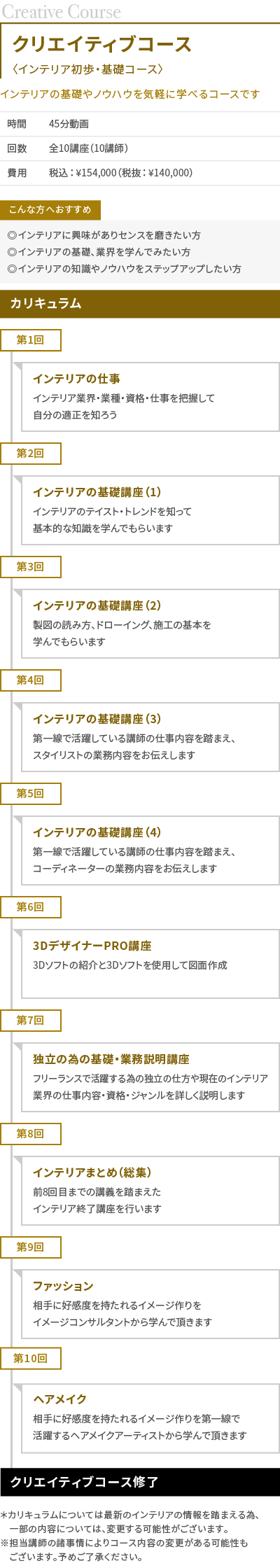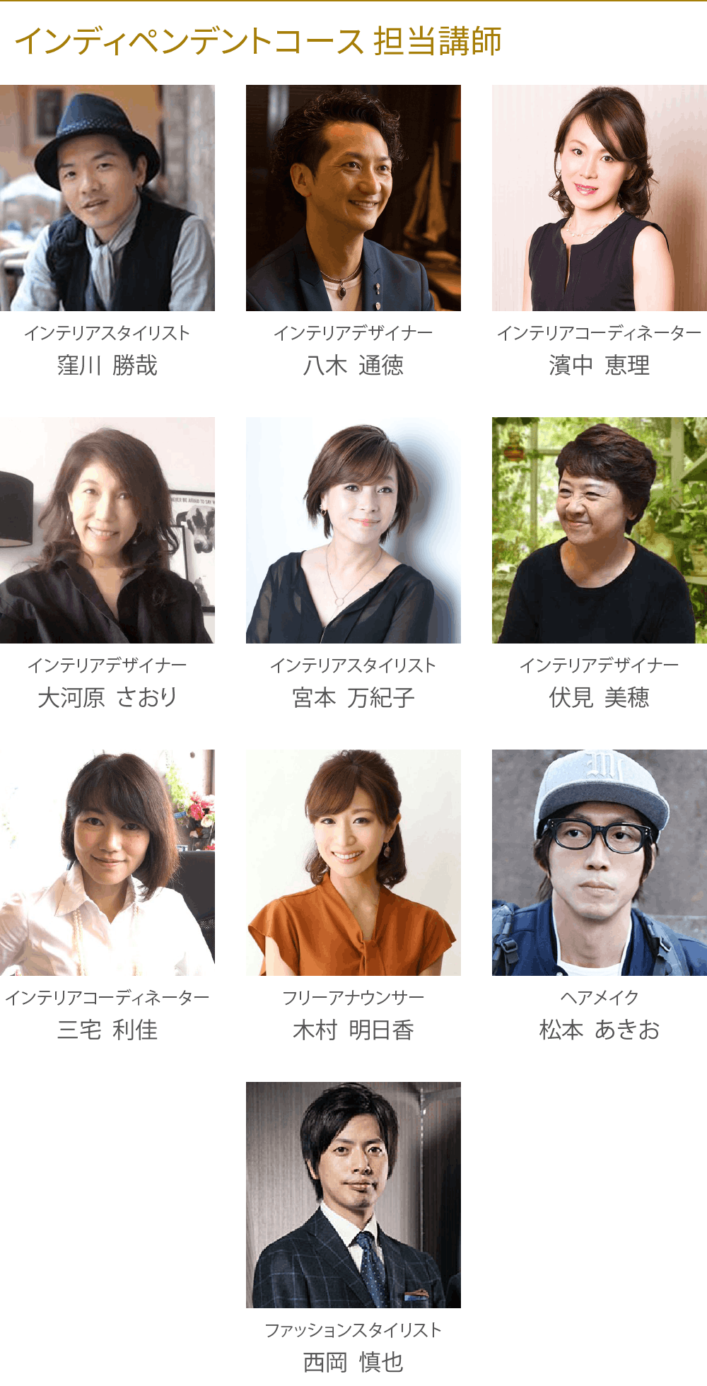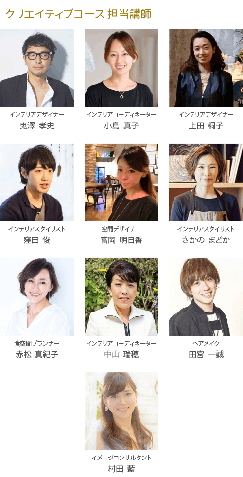 リアルなインテリアの仕事に必要な基礎知識のみならず、人間力やコミュニケーション能力の向上、セルフブランディング、ファッションやビジュアルなど様々な角度から学び、フリーランスで活躍できる人材を育てていくことを目標としております。