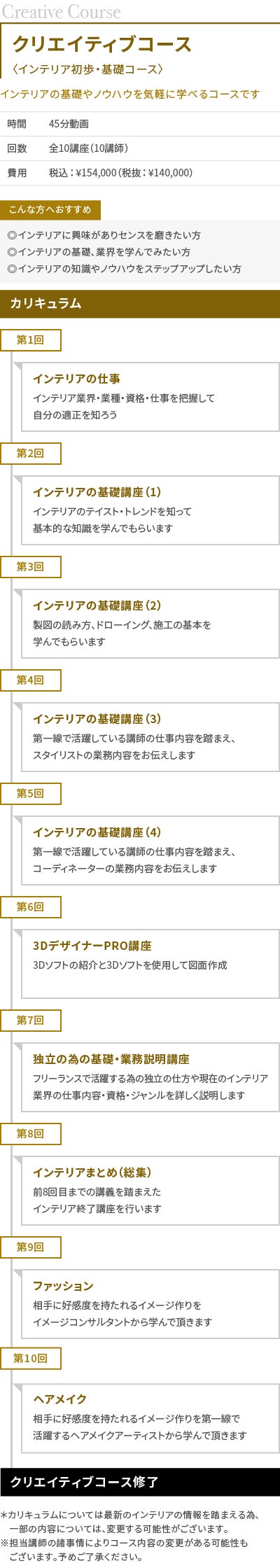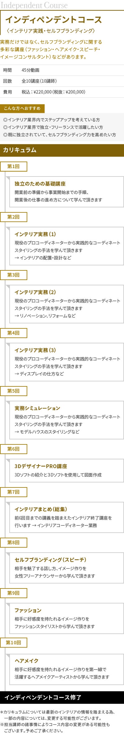 リアルなインテリアの仕事に必要な基礎知識のみならず、人間力やコミュニケーション能力の向上、セルフブランディング、ファッションやビジュアルなど様々な角度から学び、フリーランスで活躍できる人材を育てていくことを目標としております。