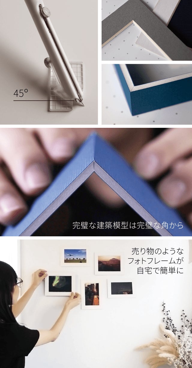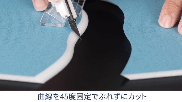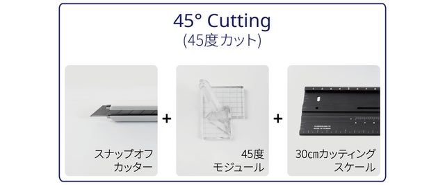 AC-451 45度モジュールは、断面の角度を45度に固定したもので、フリーハンドでの曲線カットができる優れものです。もちろん、30cmカッティングスケールと併せて直線もカットできます。従来45度カットは習得に時間のかかる難しい技術だったのですが、Perfect cutなら、柔らかい素材の端処理やフォトフレーム、建築模型の45度角合わせまで、美しく精確な断面が簡単に作れちゃいます!
