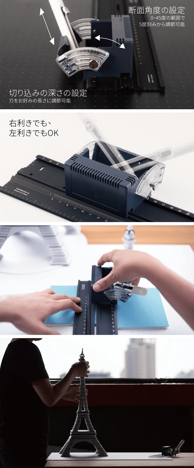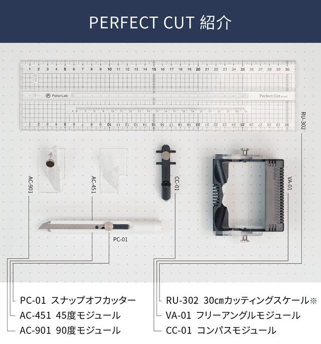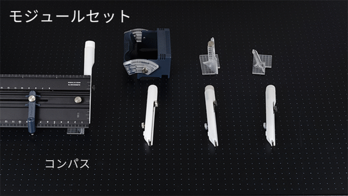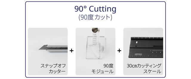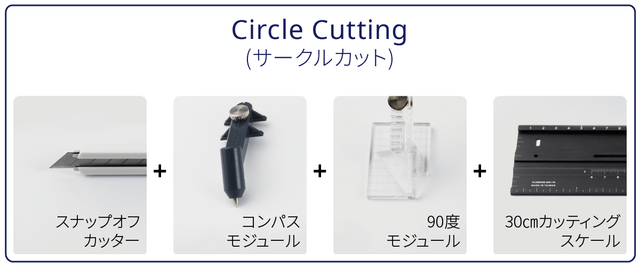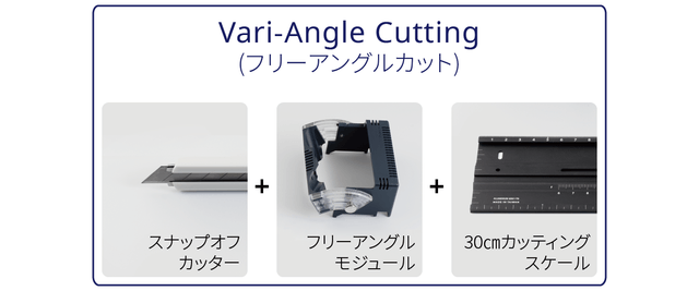 断面の角度が自由に設定できるモジュールや、片手で円形が切り取れるモジュールを含めた4種のモジュールと特製カッター、スケールをセットにしました。