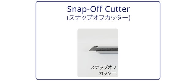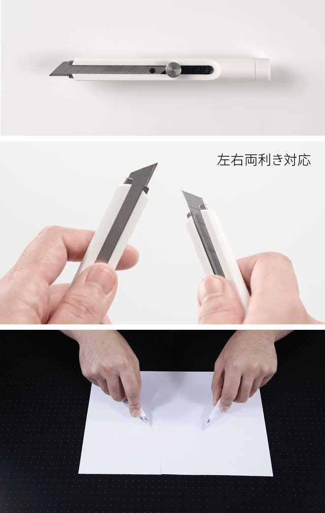 PC-01 スナップオフカッターのねじ部分はモジュールを固定する役割のほかに、単独で使用する時にも指を引っ掛けて使用でき、安定感抜群で、細かい操作が可能です。右利きも左利きも使えて、後部には刃折り用の溝がついているので、刃先を常に鋭利な状態に保てます。