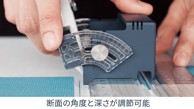 VA-01 フリーアングルモジュールは、0~45度の範囲で角度を5度刻みから設定可能。切り込みの深さも自由に調節できます。RU-302 30㎝カッティングスケールと併せて使用すれば、一般のカッターでは難しい角度付きカットも、ガタつきのないシャープで精確な断面に仕上げられます。