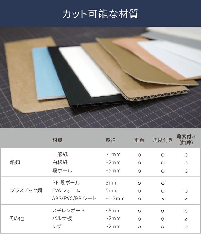 1mm以下の各種紙類は原則的にカット可能です。切りにくいとされる白板紙、クラフト紙は2mm以下、段ボールは8mm以下、プラ板、PP段ボール、スチレンボードなどの斜めカットは約5mm以下までカット可能です。詳しくは「カット可能な材質」をご参照ください。