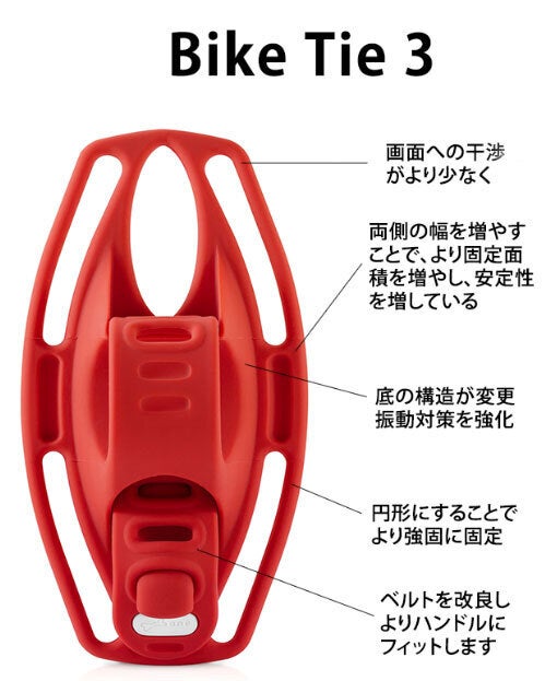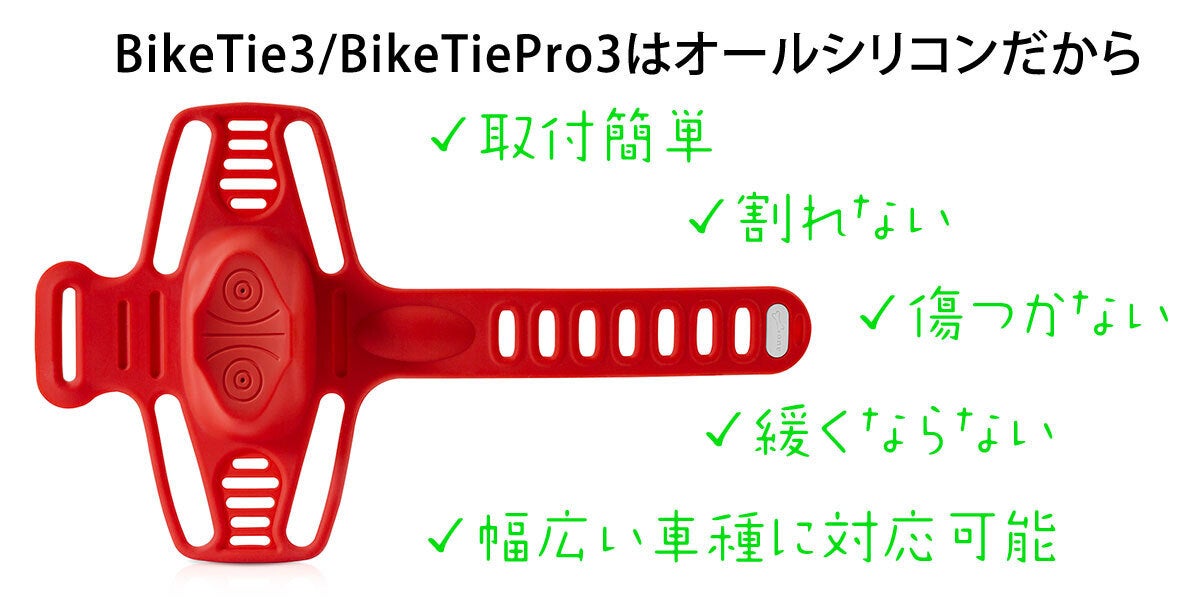 プラスチック製では実現出来なかったシンプルなデザイン、良質なシリコンによる耐久性と工具不要の簡単取り付けがBiKeTieシリーズの大きな特徴です。