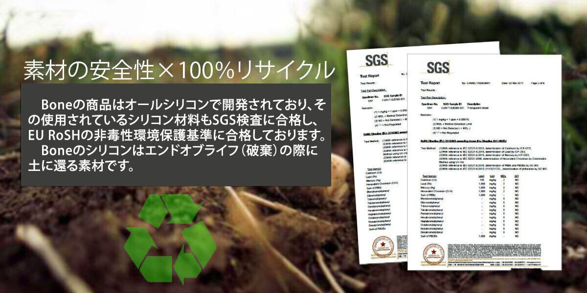 開発パートナーであるBONE製品のシリコン材料は、SGS検査に合格し、EU RoHsの非毒性環境保護基準に合格しております。