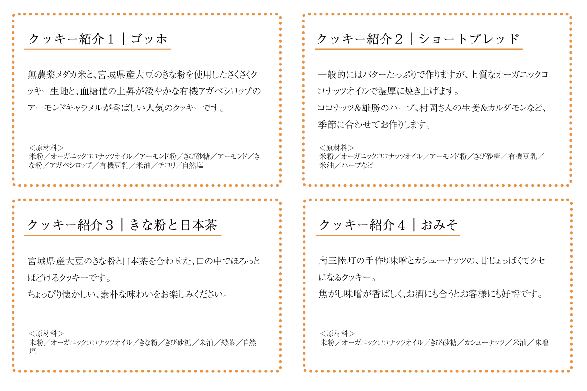 米粉だけでなく、クッキーに入っているハーブ、味噌などの材料も宮城県産のものにこだわっています。