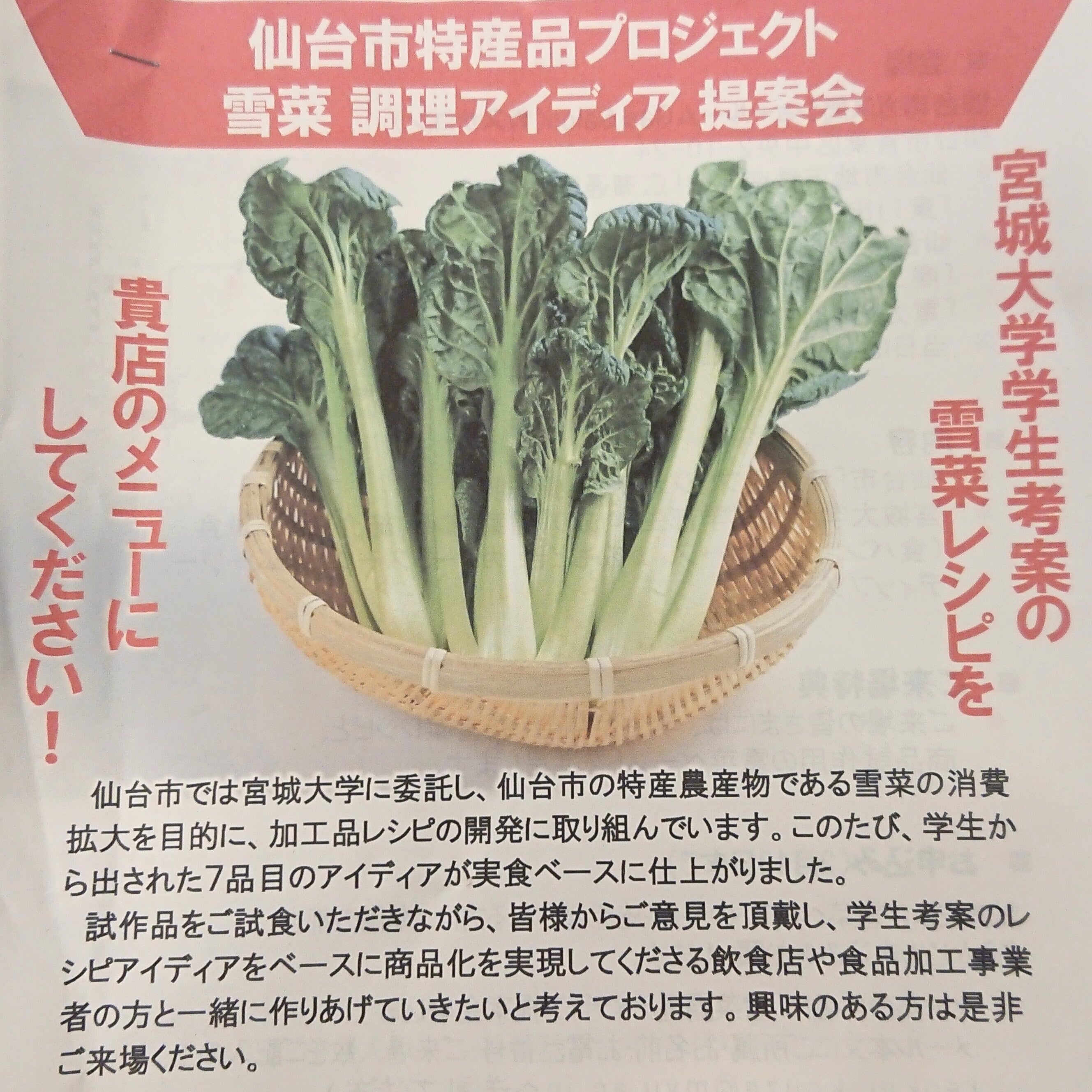 本日は【仙台市特産品プロジェクト 雪菜 調理アイデア提案会】に行って参りました。