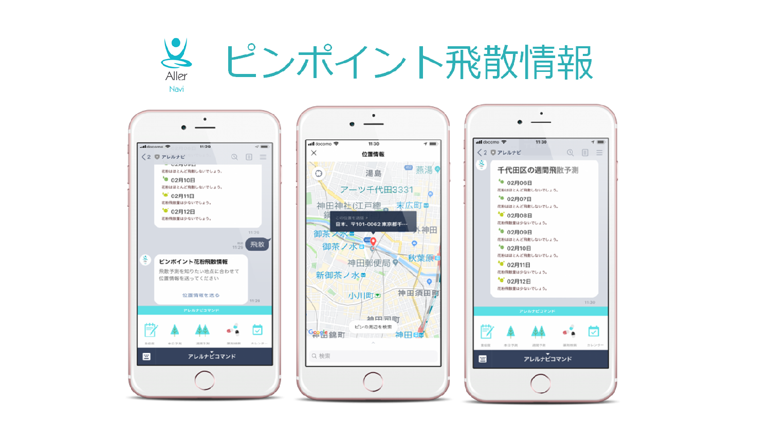 送っていただいた位置情報によりピンポイントのスギ・ヒノキ花粉飛散予測が7日先まで分かります。