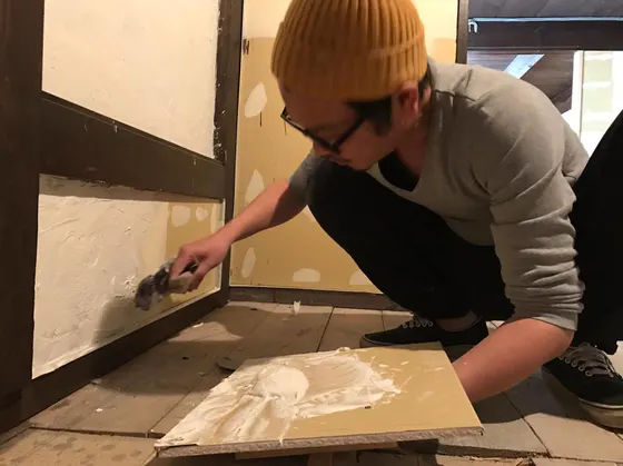 現場での作業は現在、5月のゲストハウス、シェアハウスオープンに向けて壁の漆喰塗り作業の真っ只中です。