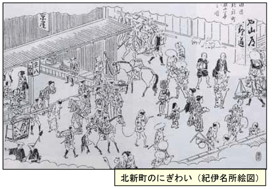 その昔、海沿いを通ってきた熊野参詣道は、田辺から山中を通る「中辺路」と海沿いを那智へ向かう「大辺路」に分かれておりその分岐点だった田辺は、熊野の入り口ということから『口熊野』と呼ばれていました。北新町(三栖口)には、その分岐点を示す道標が残されています。周辺の街並みは、熊野詣の旅人宿で賑わったメインストリートだったそうです。