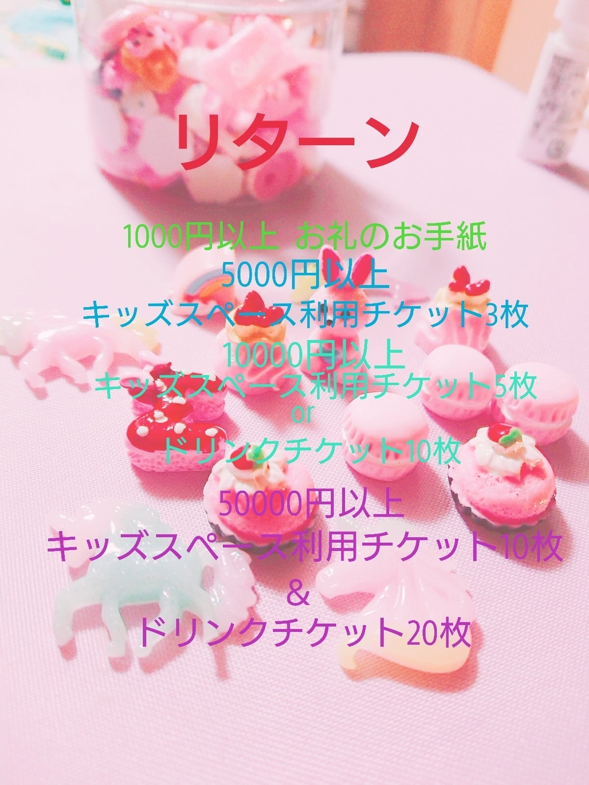 10000円以上 キッズスペース利用チケット5枚orカフェで使えるドリンクチケット10枚、お礼のお手紙