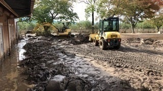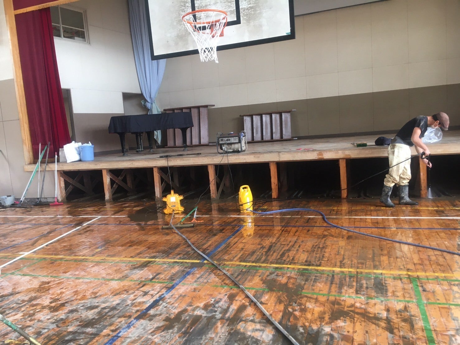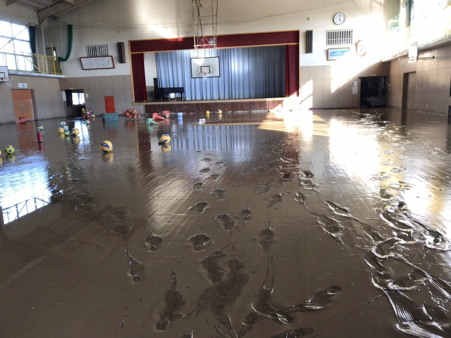 ▲水が引いた後の長沼小学校体育館周辺です。体育館の中は床上180㎝まで浸水し、ステージの上も全て泥だらけでした。
