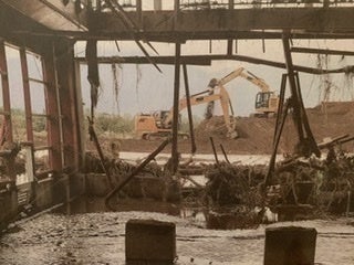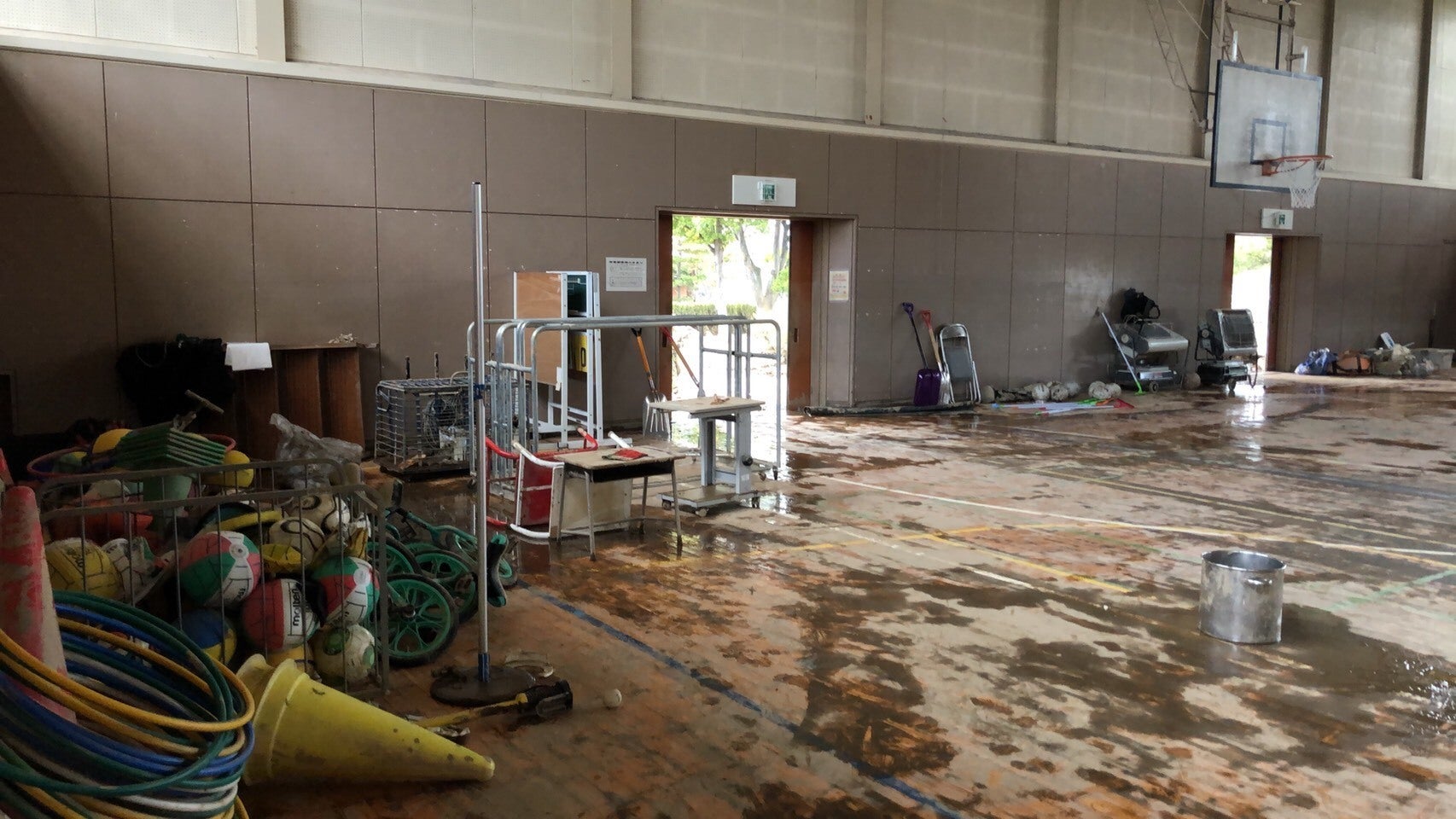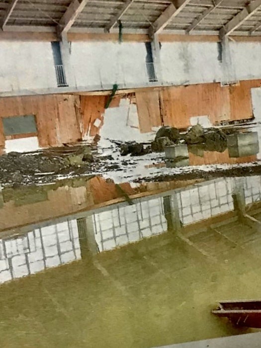 ▲長沼体育館は濁流によって床や壁が抜け、再起不能な状態です。